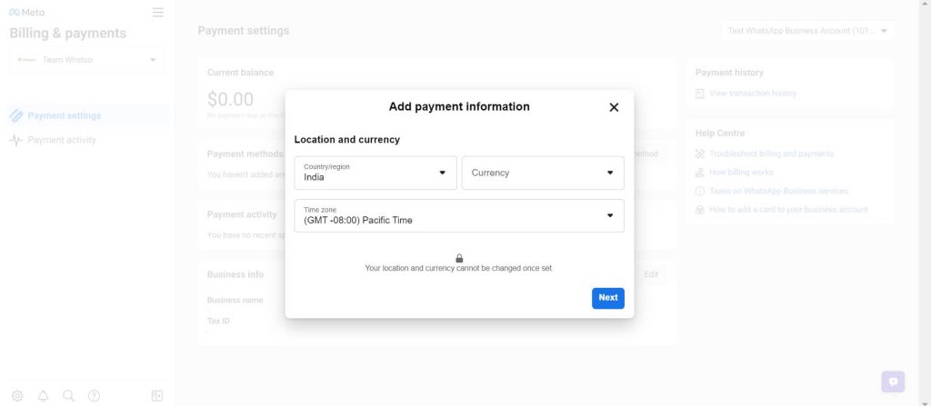 Step 5: Now It will ask to add your location and currency-related information. Enter your details and then click on “Next”. Then it will ask you for further information.