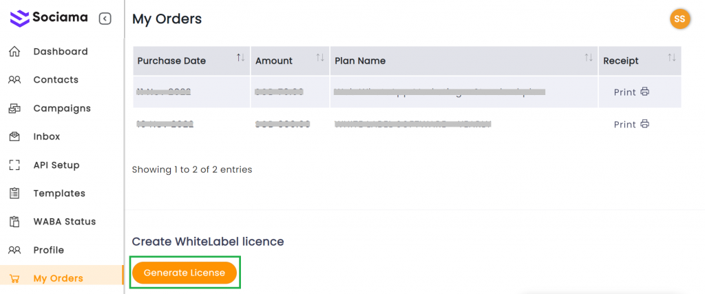 After you click on “My Orders”, the below screen will appear. Click on “Generate License” as shown below.