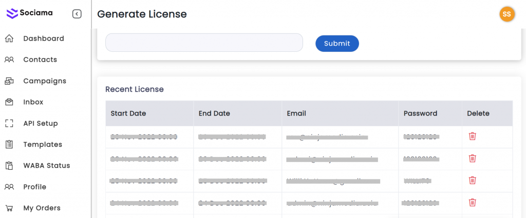 After filling all the credentials, click on submit and all the generated license will be shown below.