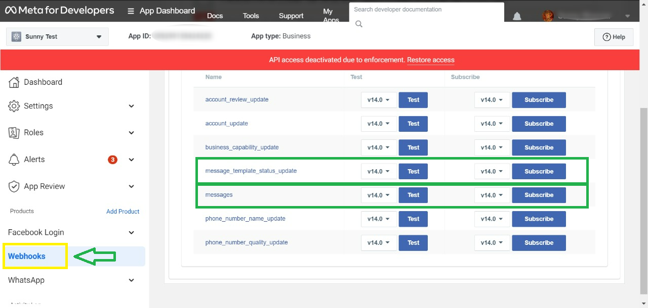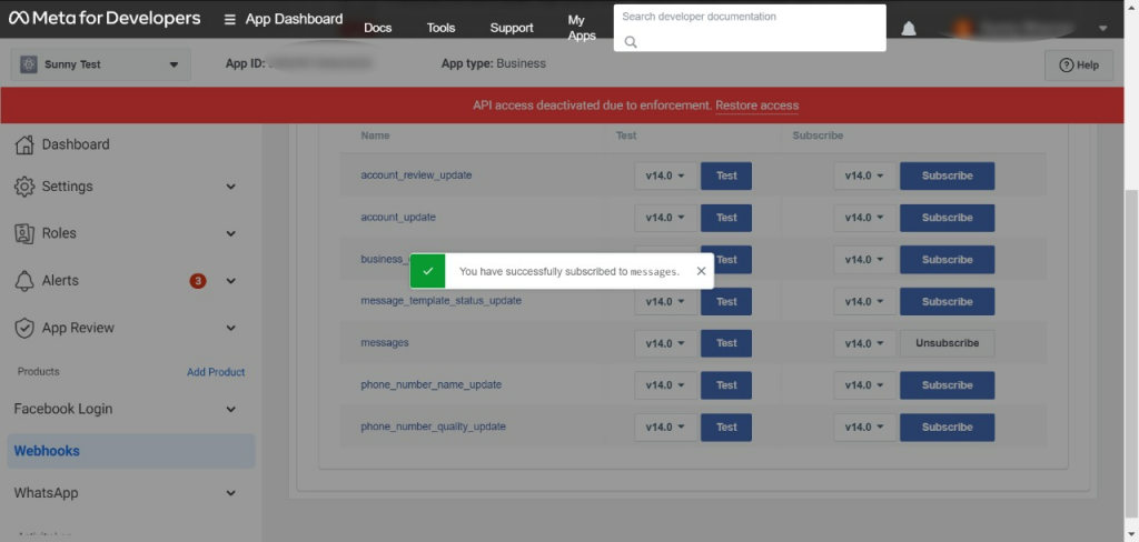 Now You can go to the “Webhooks” Tab and find the messages and message_template_status_update and tap on both the “Subscribe” button.