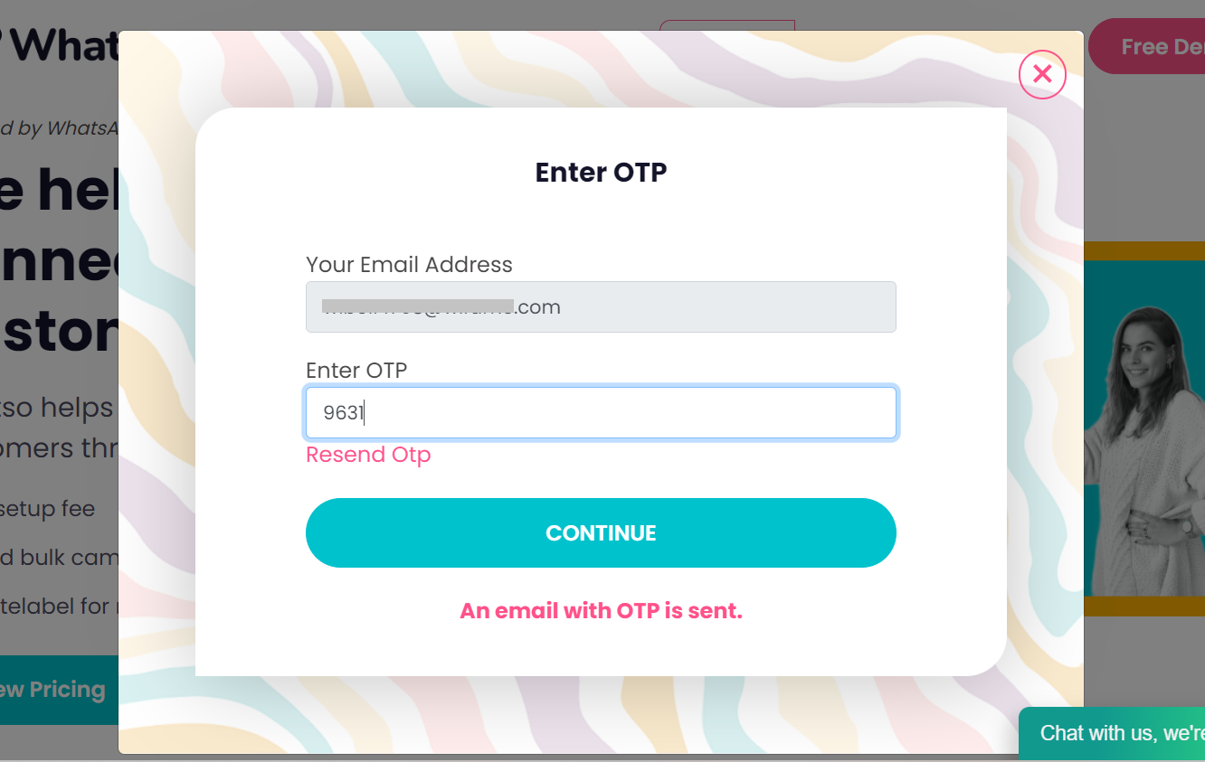 As soon as you click on continue button, “Enter OTP” popup will appear. Here, enter the OTP, which is in your registered email address.